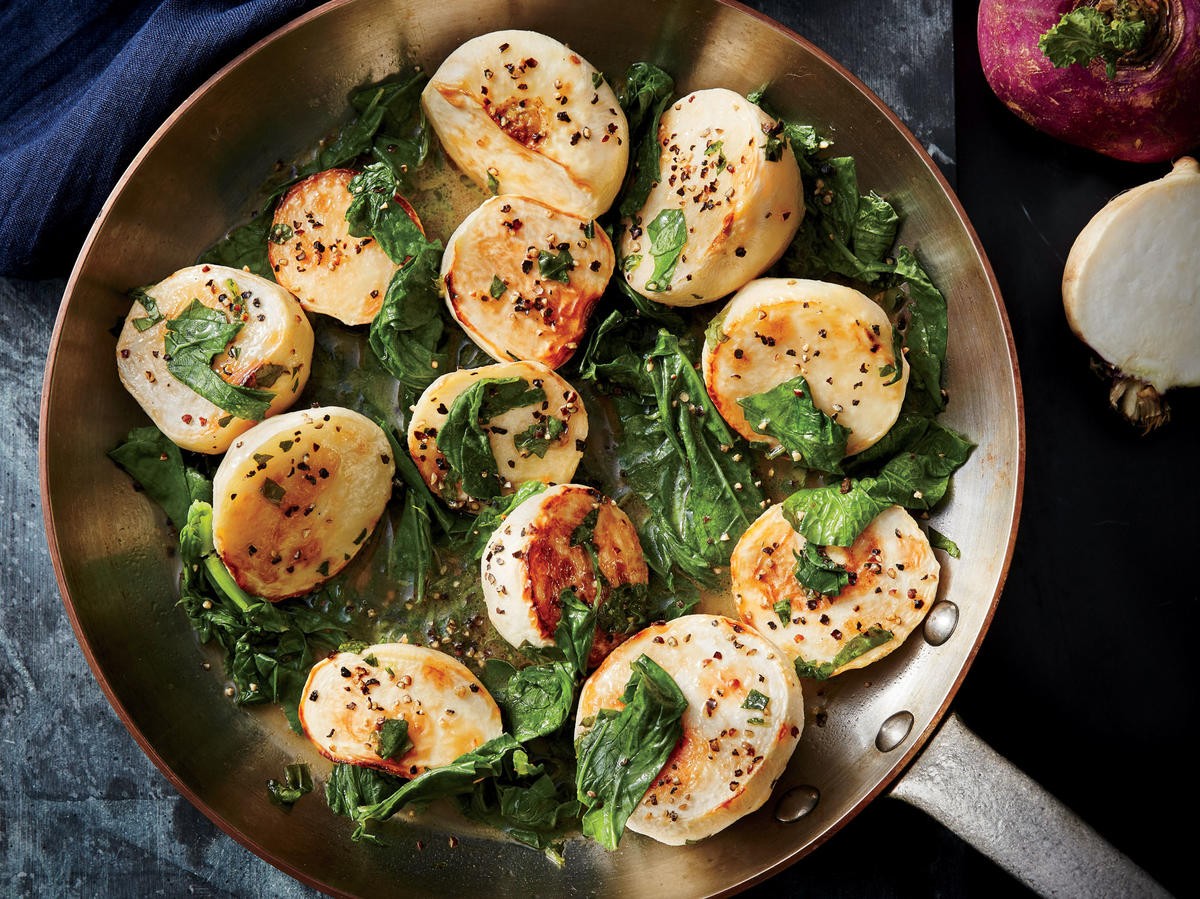 Young turnip roots are eaten raw in salads or pickled, they are also cooked and served whole or mashed and are used in stews Turnip greens are a common side dish in southeastern U.S. cooking, primarily during late fall and winter. Turnip roots are excellent source of dietary fiber, vitamin C and vitamin B6, folate, calcium, potassium, and copper. The greens are an excellent source of vitamins A and C, as well as a good source of calcium, iron, and riboflavin. Some evidence shows the turnip was domesticated before the 15th century BC; it was grown in India at this time for its oil-bearing seeds.