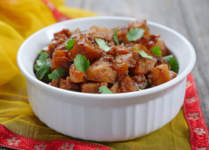 4. Now add in the turnips, potatoes and bhunofy for 1 minute, add a little water and mix, cover, simmer and cook the subzi for 12-20 mins, stir in between and check for seasonings, add in aamchur and fresh coriander leaves and serve hot with phulkas, rotis and parathas etc.