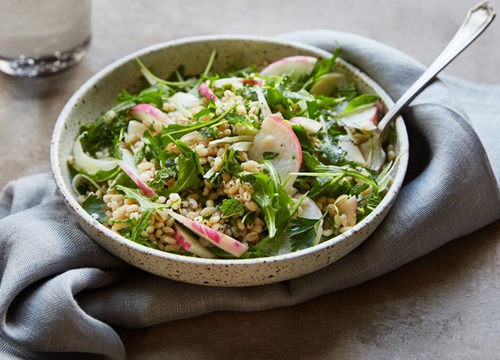 4. Arrange the lettuce leaves on a salad plate, in a mixing bowl combine together the body of the salad with turnips, cooked barley along with other ingredients and add the dressing, toss the salad.